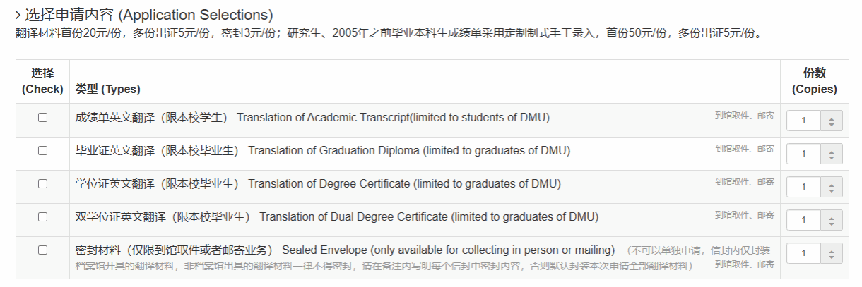 3、勾选业务类型、调整申请份数,翻译服务为收费业务,请按实际需要进行申请。收费标准请见《成绩单、学位证、毕业证中英文对照翻译服务收费标准》(https://dag.dlmu.edu.cn/info/1022/1902.htm)。