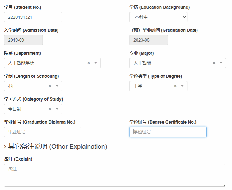4、填写本阶段个人信息,姓名中如有多音字、生僻字请在备注内注明姓名拼音,如需密封请写明需要密封的内容,学号或其他内容如遗忘可暂不填写。